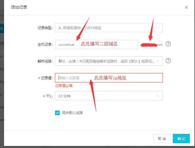 2、點(diǎn)擊添加記錄后,根據(jù)所彈窗給出的框條寫(xiě)上即可,記錄類(lèi)型選擇A即可,主機(jī)記錄可以看旁邊的一個(gè)問(wèn)號(hào)有所提示,根據(jù)自己所需填寫(xiě),最后就是記錄值,填寫(xiě)你的服務(wù)器IP或者空間IP即可,在確定就完成了二級(jí)域名設(shè)置。