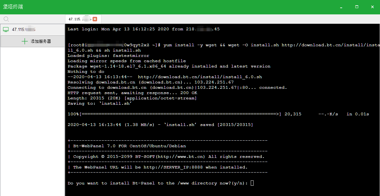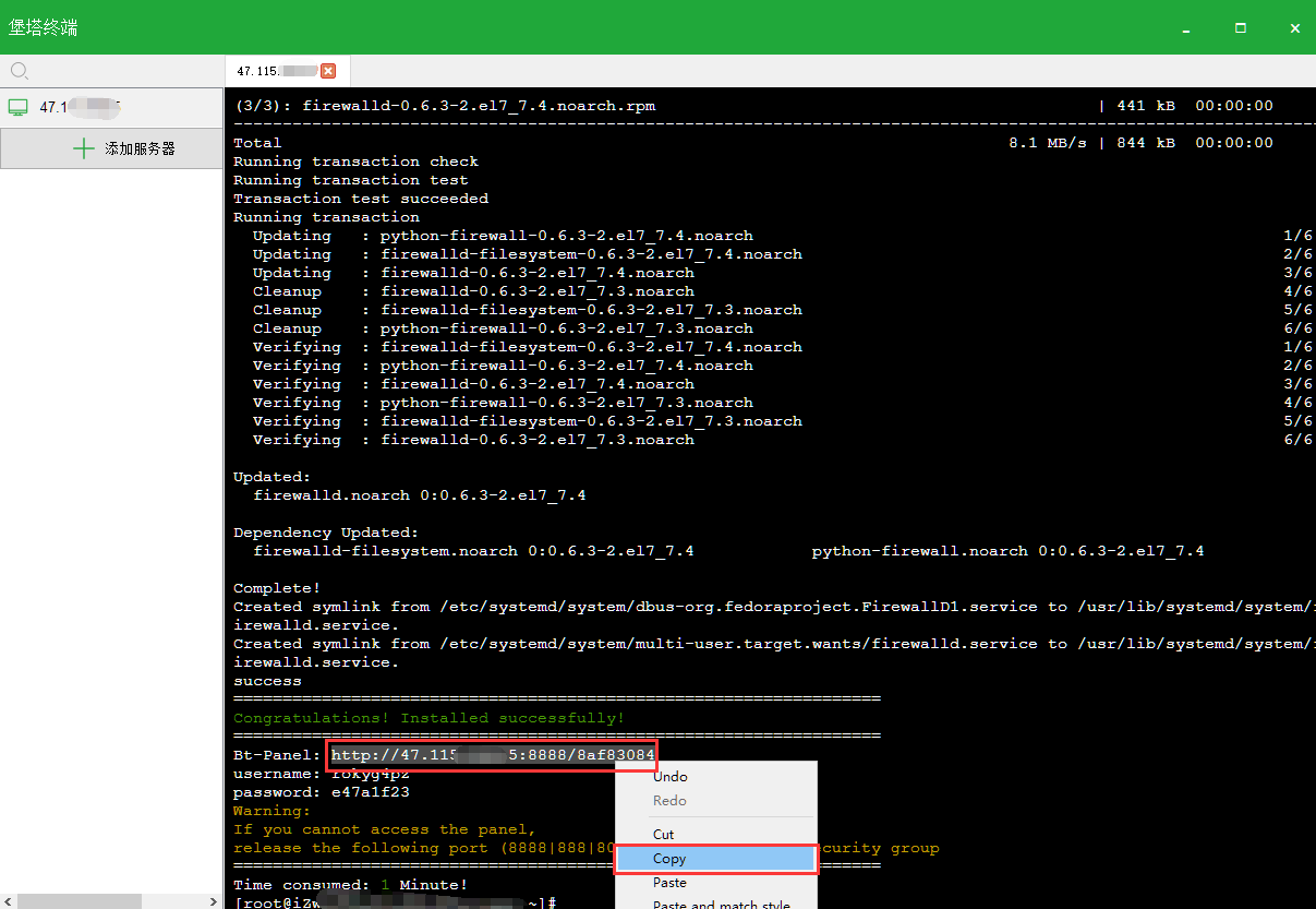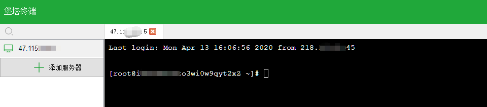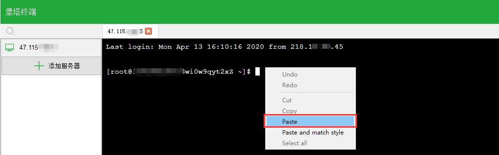2、復制以上命令代碼后,打開堡塔遠程工具并連接你的Linux服務器,粘貼已復制好的Centos安裝命令代碼。